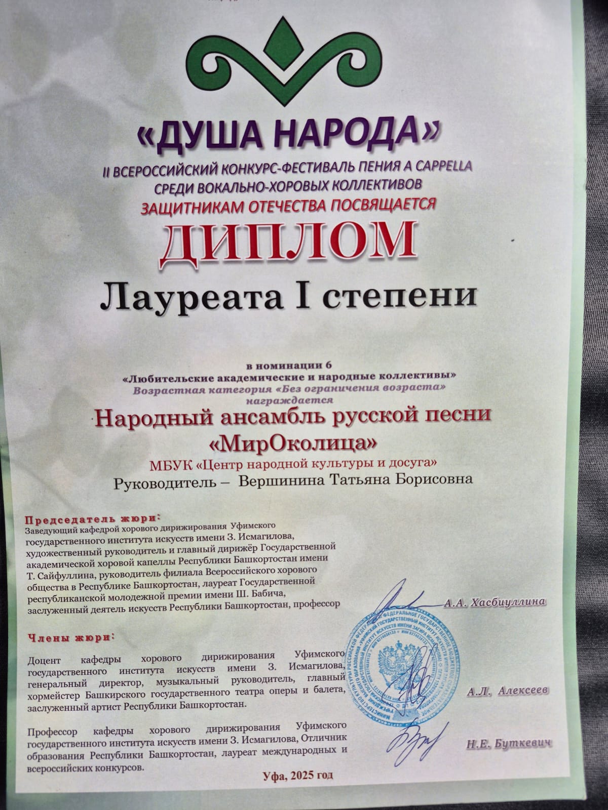 Поздравляем ансамбль русской песни «МирОколица» с заслуженной наградой. Желаем неиссякаемого творчества, успехов и благодарных слушателей.