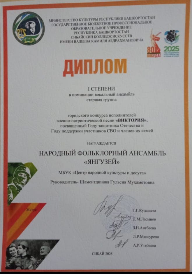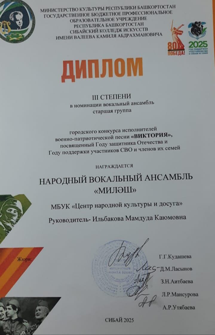 Ватанды һаҡлаусылар һәм МХО-ла ҡатнашыусыларға ярҙам итеү йылы айҡанлы Сибай сәнғәт колледжында “Виктория” Хәрби-патриотик йырҙарҙы башҡарыусылар ҡала конкурсы ойошторолдо. Сибай ҡалаһының Халыҡ мәҙәниәте һәм ял үҙәгенең “Миләш” халыҡ вокал ансамбле (етәксеһе БР-ың мәҙәниәт хеҙмәткәре Мәмдүҙә Ҡәйүм ҡыҙы Илбәкова) — III дәрәжәле Диплом менән бүләкләнде. I дәрәжәле дипломға “Йәнгүҙәй” халыҡ фольклор ансамбле ( етәксеһе Гөлсиә Шәмситдинова) лайыҡ булды. Ә инде Халыҡ ветерандары хоры (етксеһе Н.А. Давыдова) ГРАН-ПРИ яуланы.