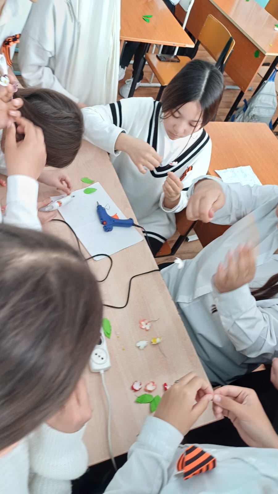 Сегодня в МОБУ Лицей «Ирандык» для учеников 7 класса прошëл мастер-класс «Цветущий май» по изготовлению декоративной броши с использованием символа Дня Победы — Георгиевской ленты, чтобы сохранить память и гордость за Победу нашей страны в Великой Отечественной войне. Каждый ученик создавал свою брошь из георгиевской ленты и фоамирана, чтобы добавить оригинальности своим изделиям, вложив частичку своей души. Каждый смог проявить свою фантазию и индивидуальность при создании броши. Это мероприятие стало не только творческой площадкой, но и поводом для разговоров о патриотизме и уважении к героям. В завершение мастер-класса каждый рассказал о значении своей броши и о том, почему важно помнить подвиги предков. Мастер-класс оставил яркие впечатления у всех, вдохновляя детей на дальнейшие творческие успехи и сохранение исторической памяти.