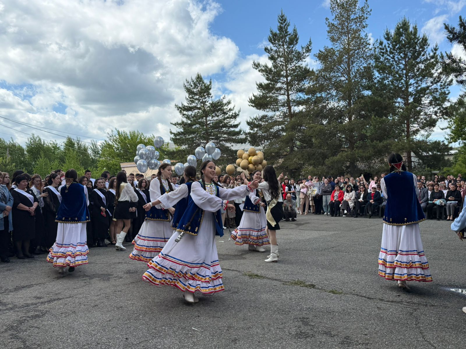 Между чествованиями на выпускном выступили образцовый хореографический ансамбль «Оскон», а так же прекрасные Эмма и Арина Ракаевы, которые исполнили песню «Прекрасное далёко».
